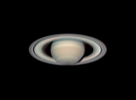 Saturn am 25.08.2022, 21:30 UT, nur 18° über dem Horizont. Teleskop: Celestron SC C14 mit Televue Powermate 2x,
