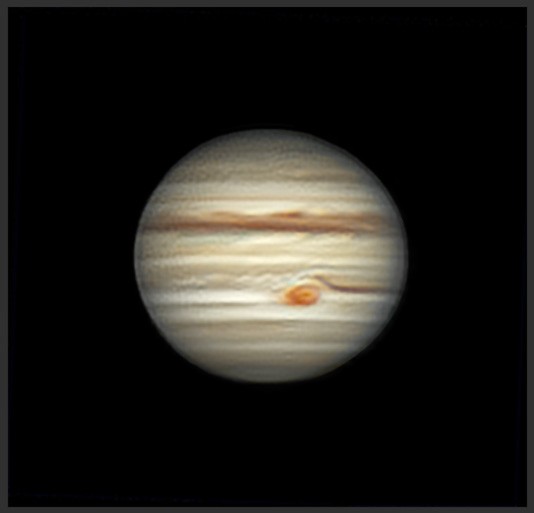 Jupiter am 7. Juni 2018, Kamera: QHY 183C, Objektiv: Meade LX200GPS (12 Inch), Software: AutoStakkert!3 (gestackt), RegiStax6 (geschärft), mit WinJupos derotiert, und mit Adobe PS CS2 (nachbearbeitet).